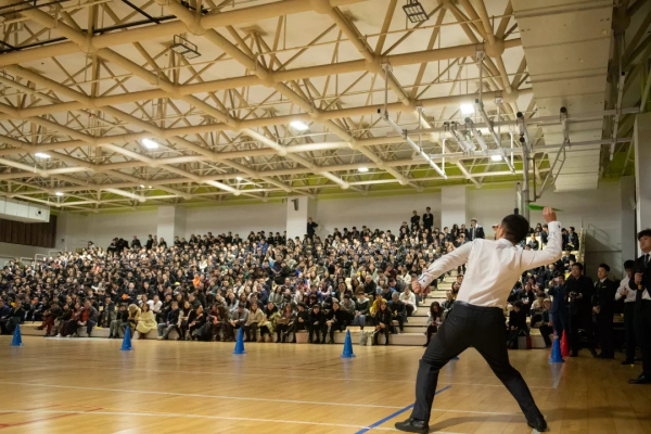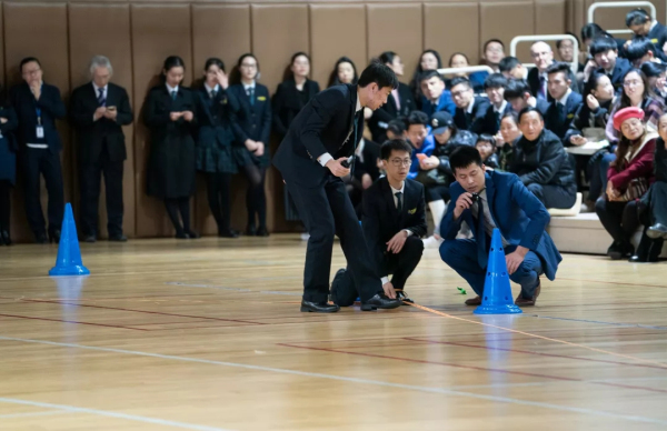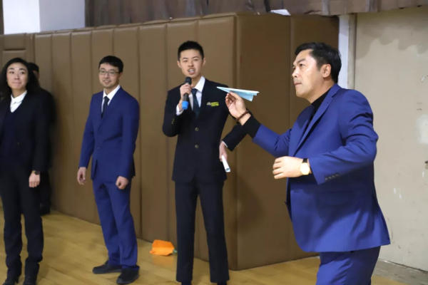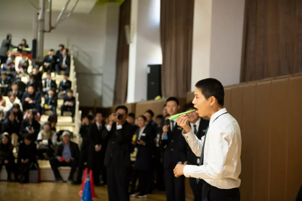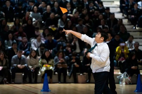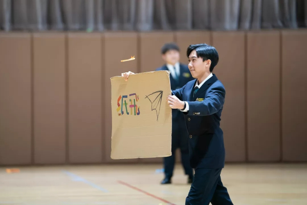 11D班王聿骐利用空气动力原理,让纸飞机如施了魔法般地随着他手中的纸板游走。一时间,场上掌声雷动,评委不约而同亮出10分。