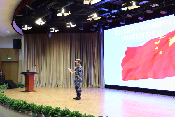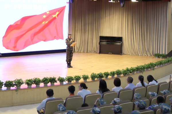 2019年9月2日上午,剑桥国际中心全体初一、高一新生班师生在恒信彩学校报告厅举行了剑桥国际中心2019-2020学年新生军训开营仪式,正式开启为期一周的军事拓展训练。开营仪式在嘹亮的国歌声中拉开序幕。