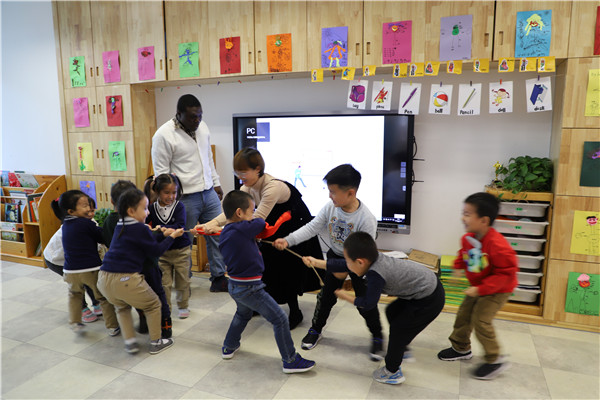 外教老师给我们带来一种全新的思维模式体验,看的见摸得着的可以讲,看不见摸不着的也可以讲,用实际行动感受力的存在,孩子们一个个的变的力大无穷,这样的游戏太好玩啦!