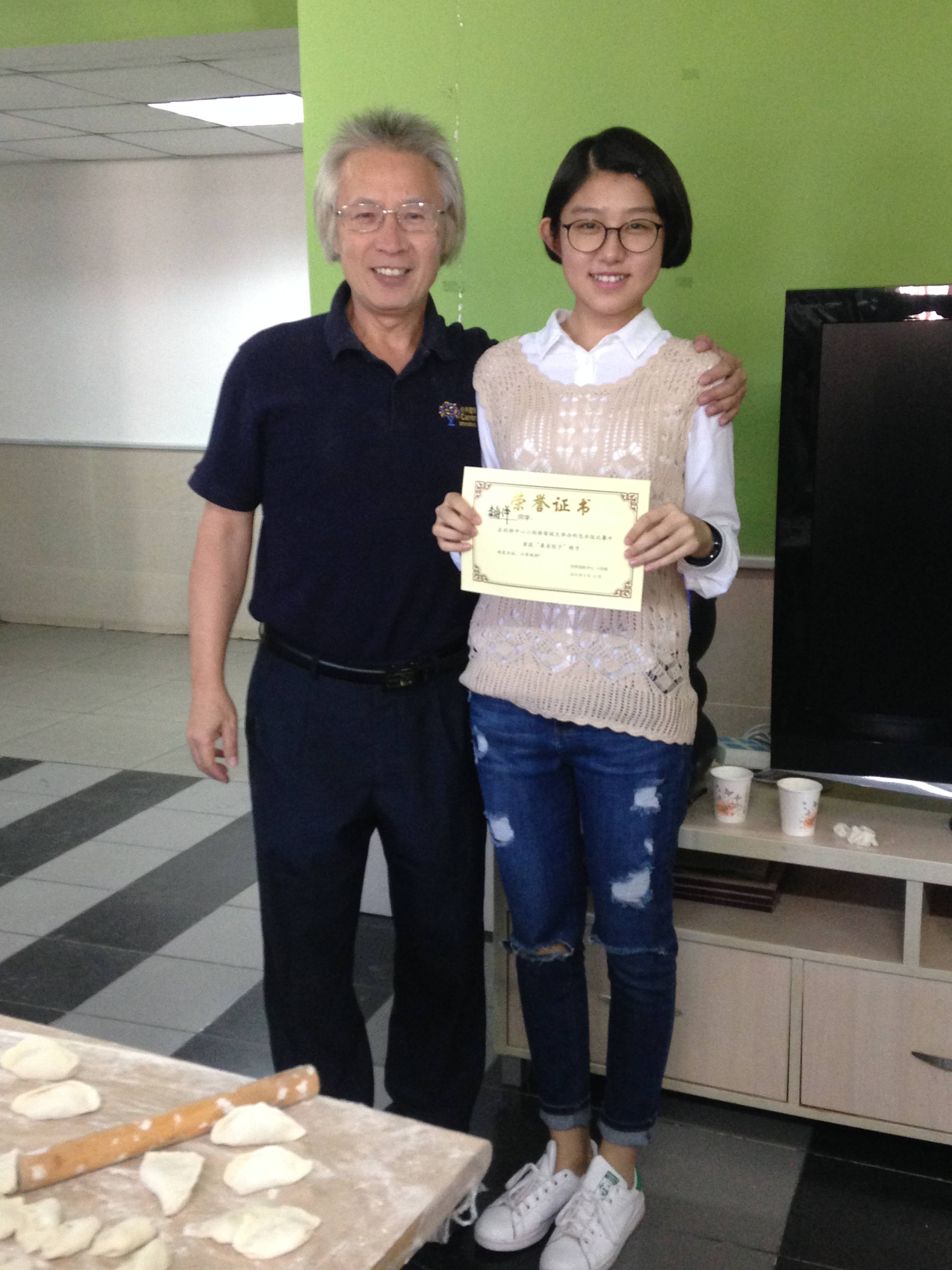我很荣幸得到了“包饺子大赛中最佳妙手奖”,以后我继续努力!