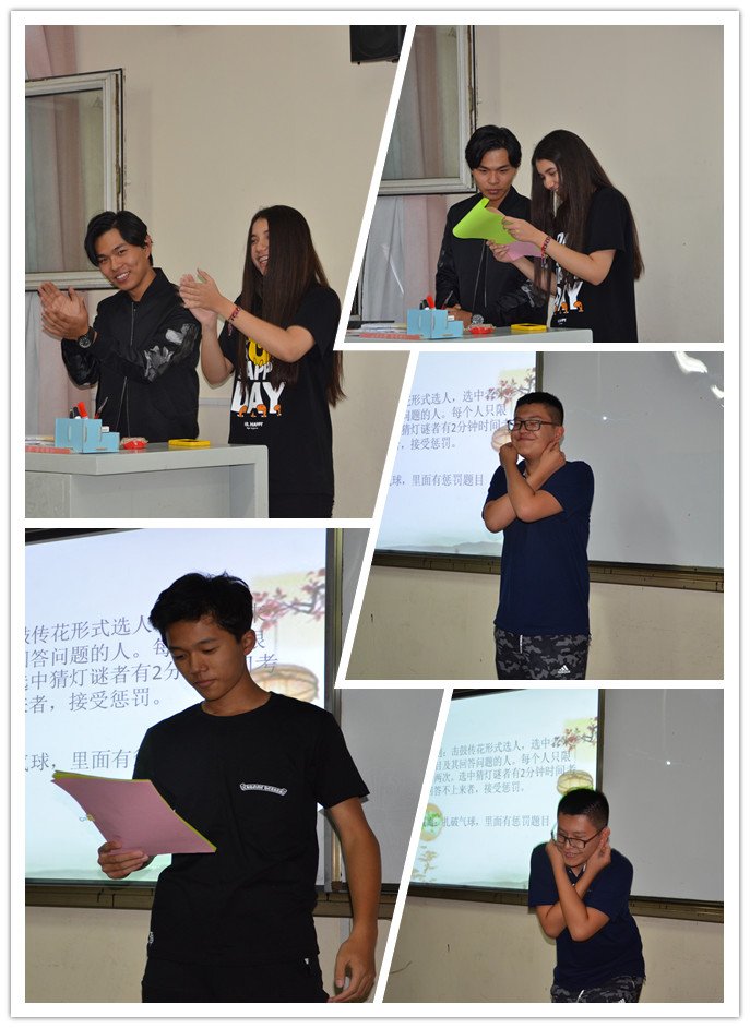 各班还举行了热热闹闹的喜迎中秋“字谜竞猜”活动,别出心裁的活动形式和丰富多样的奖品设置,吸引了同学们积极参与。这些谜题涉及范围广,融知识性、趣味性于一体,同学们个个摩拳擦掌,有的举目凝望,有的埋头思考,大家还不时你一言、我一语地互相提示与讨论,不时地为不同的答案而争得不亦乐乎,各班不时地传出或欢呼雀跃或顿足唉叹之声。猜中者自当是踌躇满志各种开吃,不中者只好“任人鱼肉”接受各种神奇罚跳。
