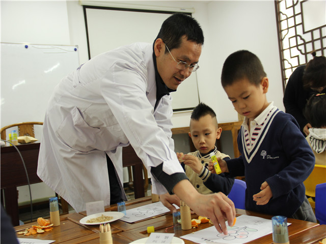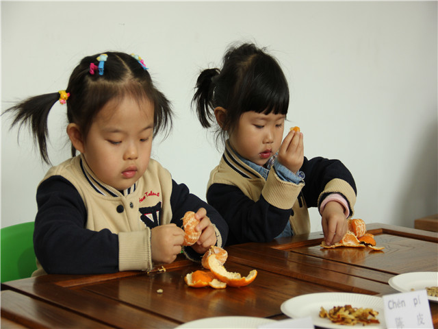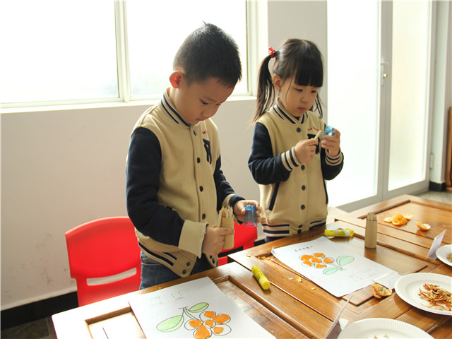 最后,小朋友们走进了金方书院。了解橘子其实除了果肉和果皮具有营养和功效外,还有一些其他的作用是鲜为人知的。橘络是橘皮内层的网状筋络。性味甘苦平,有行气通络、化痰止咳之功。橘核是橘子的果核(种子),性微温味苦平,功专理气散结止痛。并自己动手制作了橘皮画。