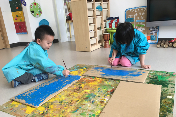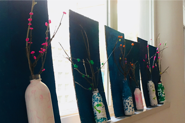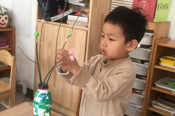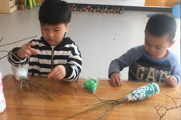 利用旧纸箱子裁成我们的画画的板子,孩子们把自己喜欢的蓝天画在板子上,把废旧的塑料瓶涂上自己喜欢的颜色,画上自己的画,一个个平常看着不起眼大家随手丢进垃圾桶的瓶子,在孩子们的小手下变成一个个有生命的花瓶。再插进去在校园里找来的小树枝,用软陶简单的装饰一下,一幅幅唯美的“蓝天下的生命”出现在我们眼前。在这里呼吁大家一起把我们生活中的可回收材料再次让他们利用起来,赋予它新的生命。