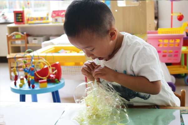 老师给小朋友们准备了各种演的吹泡泡用的水,还有吸管。将吸管一头放入盛泡泡水的小杯子里,再用嘴巴向吸管中吹气,小杯子里就出现了好多好多的泡泡。小朋友们玩的不亦乐乎。小杯子下面还有一张纸,泡泡从杯子里面蔓延出来会在纸上留下痕迹。