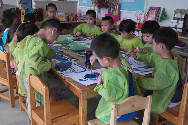 梵高的《星空》展现了一个高度夸张变形与充满强烈震撼力的星空景象。巨大的、卷曲旋转的星云,那一团团夸大了的星光,以及那一轮令人难以置信的橙黄色的明月。通过欣赏大师的作品,幼儿感受色彩强烈对比的美。在创作中,幼儿通过自己独特的大胆思维,用色彩表现自己严重的别样的星空景色