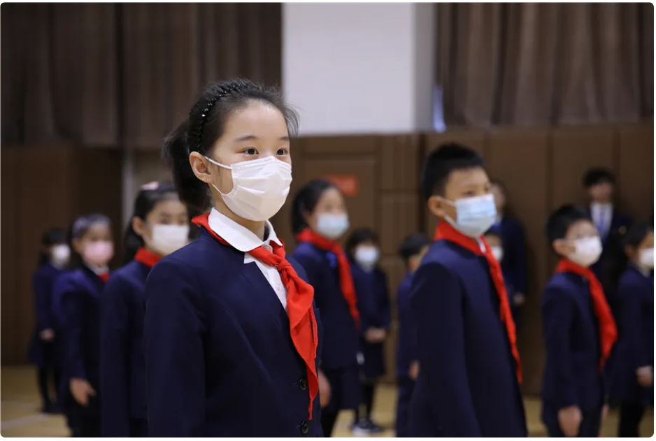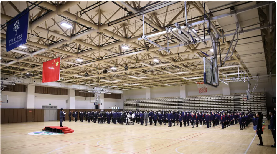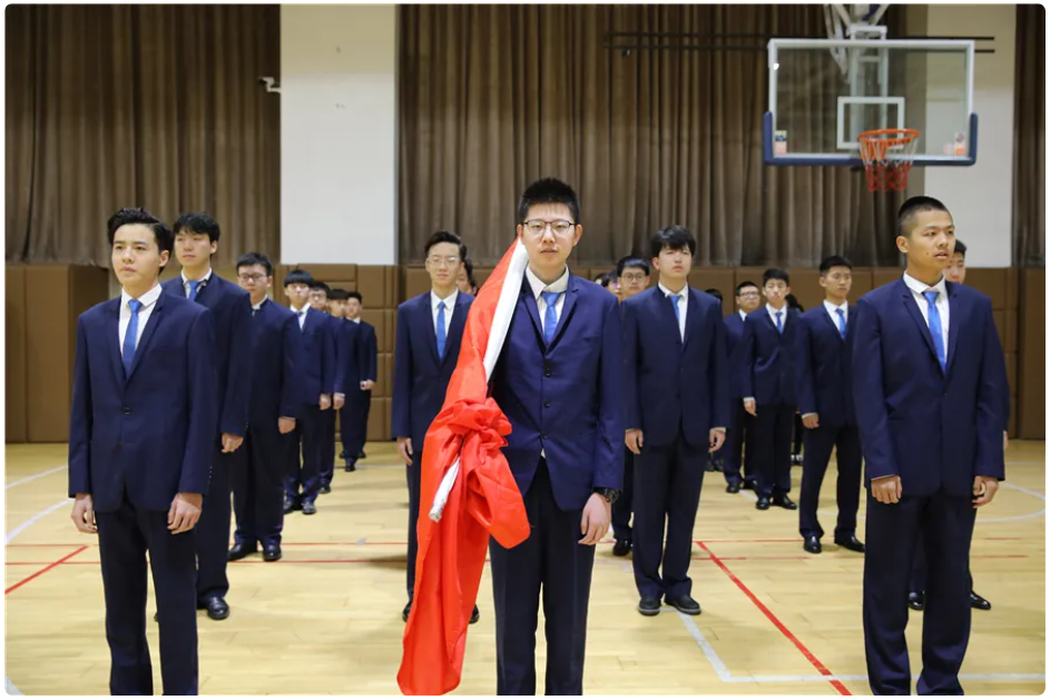 来自初中部、AP国际中心、中华英才书院的学生代表组成的国旗仪仗队踏着坚定的步伐迎面走来。