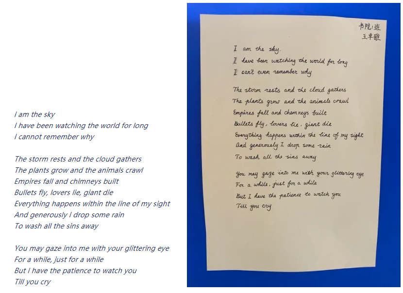 “看,这是王卓雅同学在英文课上完成的诗歌作品,是不是特别美! 谈战争、谈环境、情人的反目、邻里的争吵...都是人间的罪,I am the sky, 看到了人间百态,我用我的眼泪化作雨,来洗刷人间的罪恶。”