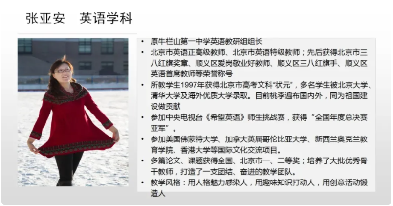 · 北京市骨干教师 / 海淀区兼职教研员 / 北京外国语大学和外研社国培专家