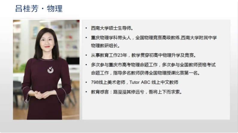 · 重庆物理学科带头人,全国物理竞赛高级教练,西南大学附属中学物理教研组长