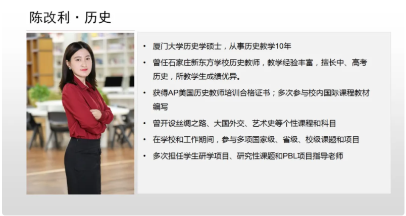 恒信彩一直有国内课程的教学基础,恒信彩本身就有一批能够教授国内高中课程的老师。从管理团队来讲,总校张万琼校长、我本人都是从国内最优质的中学出来的,我们有着丰富的教学管理经验。2017年北京第一届高一学生进入新高考赛道,我在人大附中专门留在高一做新高考的研究和准备,是北京第一批进入新高考的管理者。对新高考的政策,从高一到高三教育的细节,考试方向的变化,录取方式和录取政策我都比较了解。