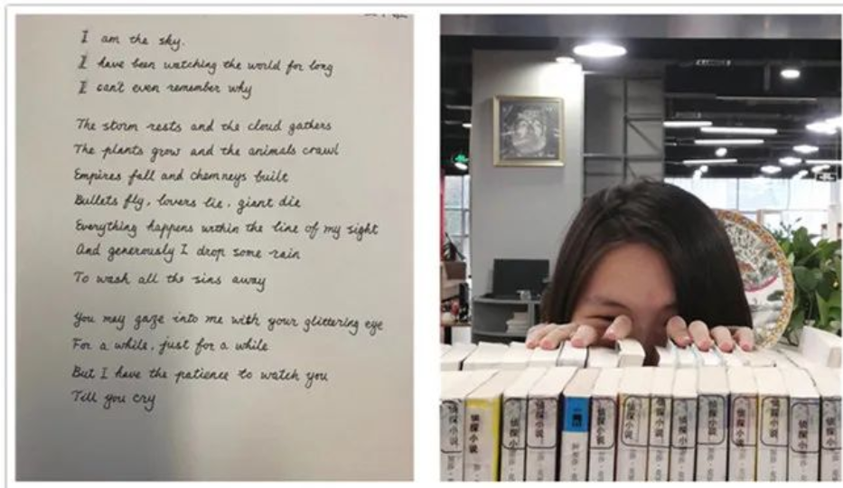 这是王卓雅同学在英文课上完成的诗歌作品。谈战争、谈环境、情人的反目、邻里的争吵……都是人间的罪,“I am the sky, 看到了人间百态,我用我的眼泪化作雨,来洗刷人间的罪恶。”这句很有灵性哦!