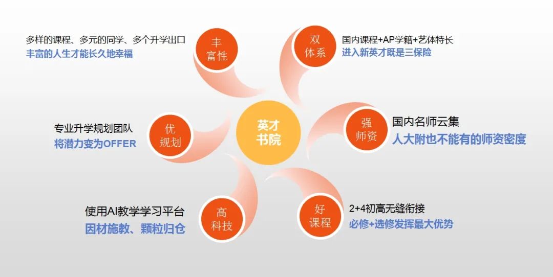 3.英才书院为每一名学生完成国内国际“双注册”。高中阶段为学生开设生涯规划相关课程。进入高二前,学校将为每一名学生进行定制化的升学规划,对于有意愿转入国际升学方向的学生进行“双轨制”培养。