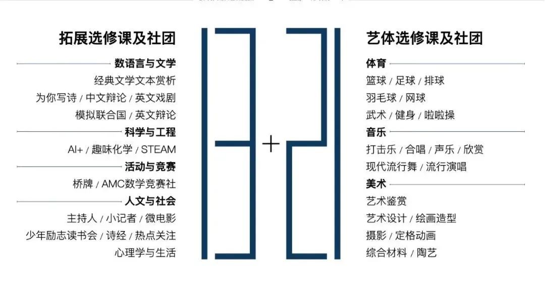 另外,还有英语戏剧、中英文辩论、经典文学文本赏析、媒介素养、播音主持等人文与社会、语言与文学拓展选修课 / 社团等,让学生拥有足够的文化沉淀和看待世界的胸怀,自如行走在两个不同文化背景的世界。