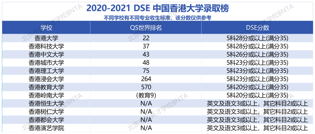 HKDSE考试难度低于内地高考,容易取得高分,无论大学录取率或申请名校的机会,都有绝对优势。目前进入“香港三大”(香港大学、香港中文大学和香港科技大学)的最低HKDSE分数大概5科总成绩在23至28分左右。