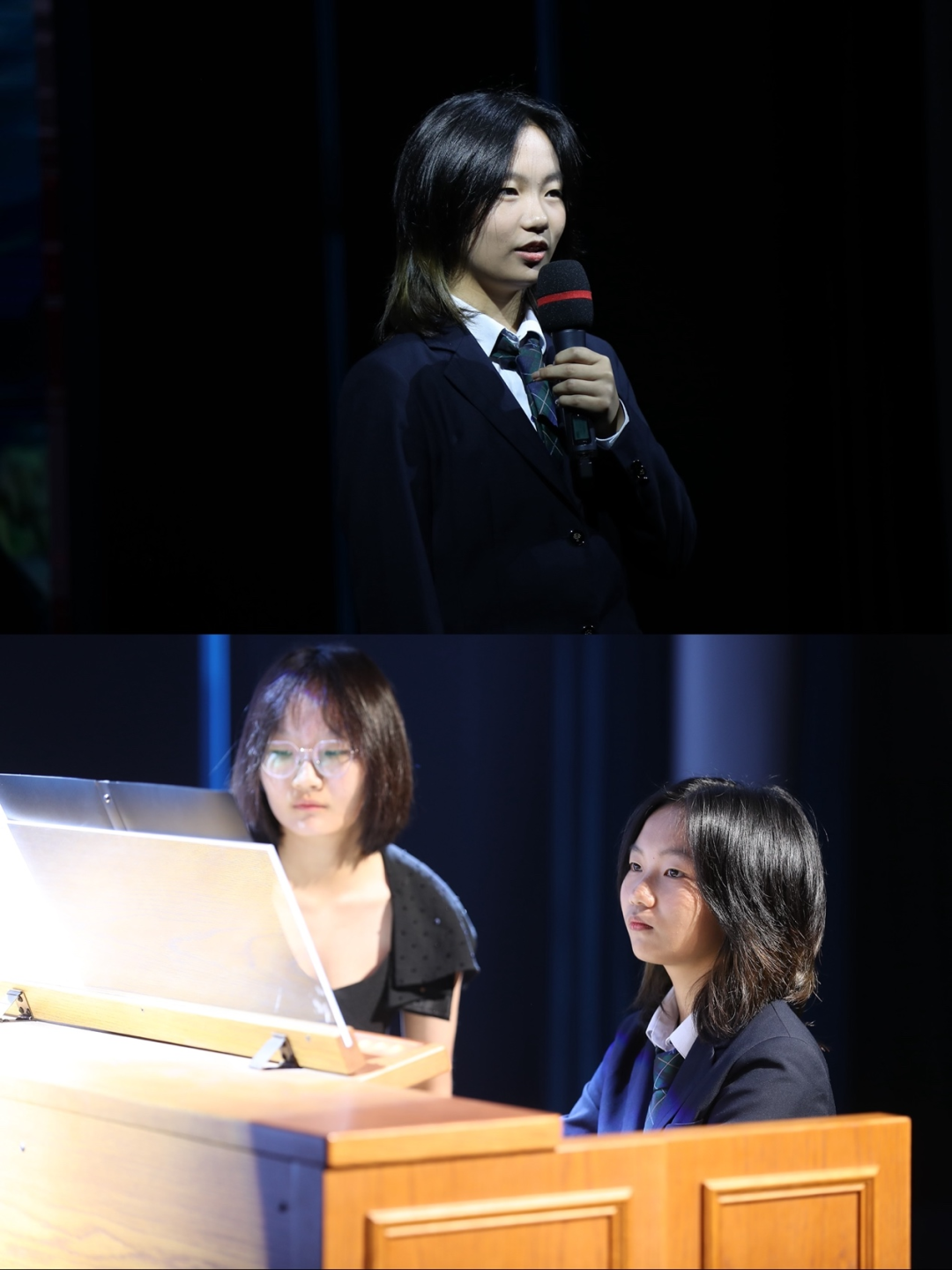 <郭子男同学> 目前就读于致美班8年级6班,她演奏的曲目是《哥特组曲》的第三、四乐章,第三乐章旋律优美抒情,经常用于婚礼仪式中,第四乐章是托卡塔题材,是一种自由、即兴风格的乐曲,以分解和弦和快速的音阶交替而成,旋律多在脚键盘。