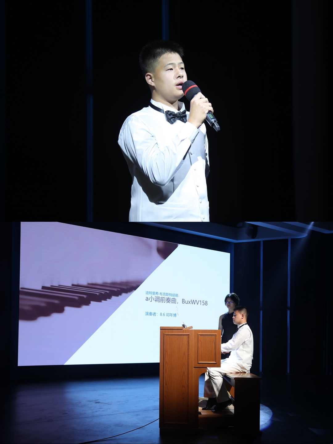 <邓年博同学> 目前就读于致美班8年级6班,演奏布克斯特胡德的作品《a小调前奏曲》,他向大家介绍到,本首乐曲是布克斯特胡德众多优秀作品中的其中一首,其中涉及到的赋格体裁,是巴洛克时期常见的音乐体裁,写作手法多变且工整。