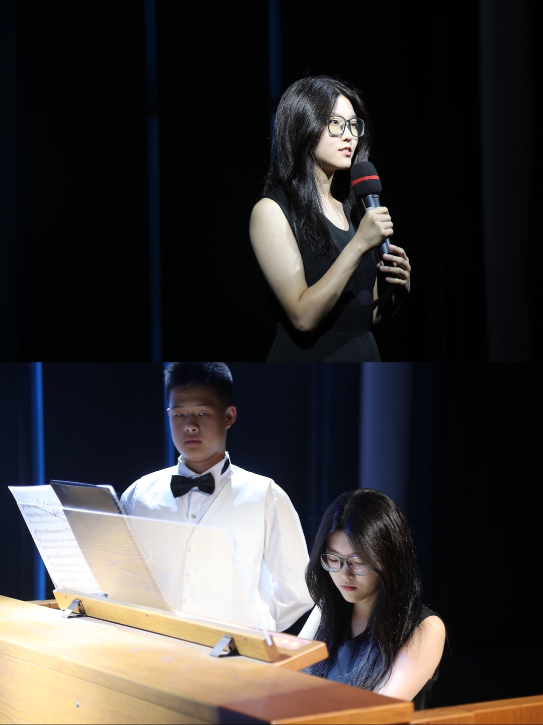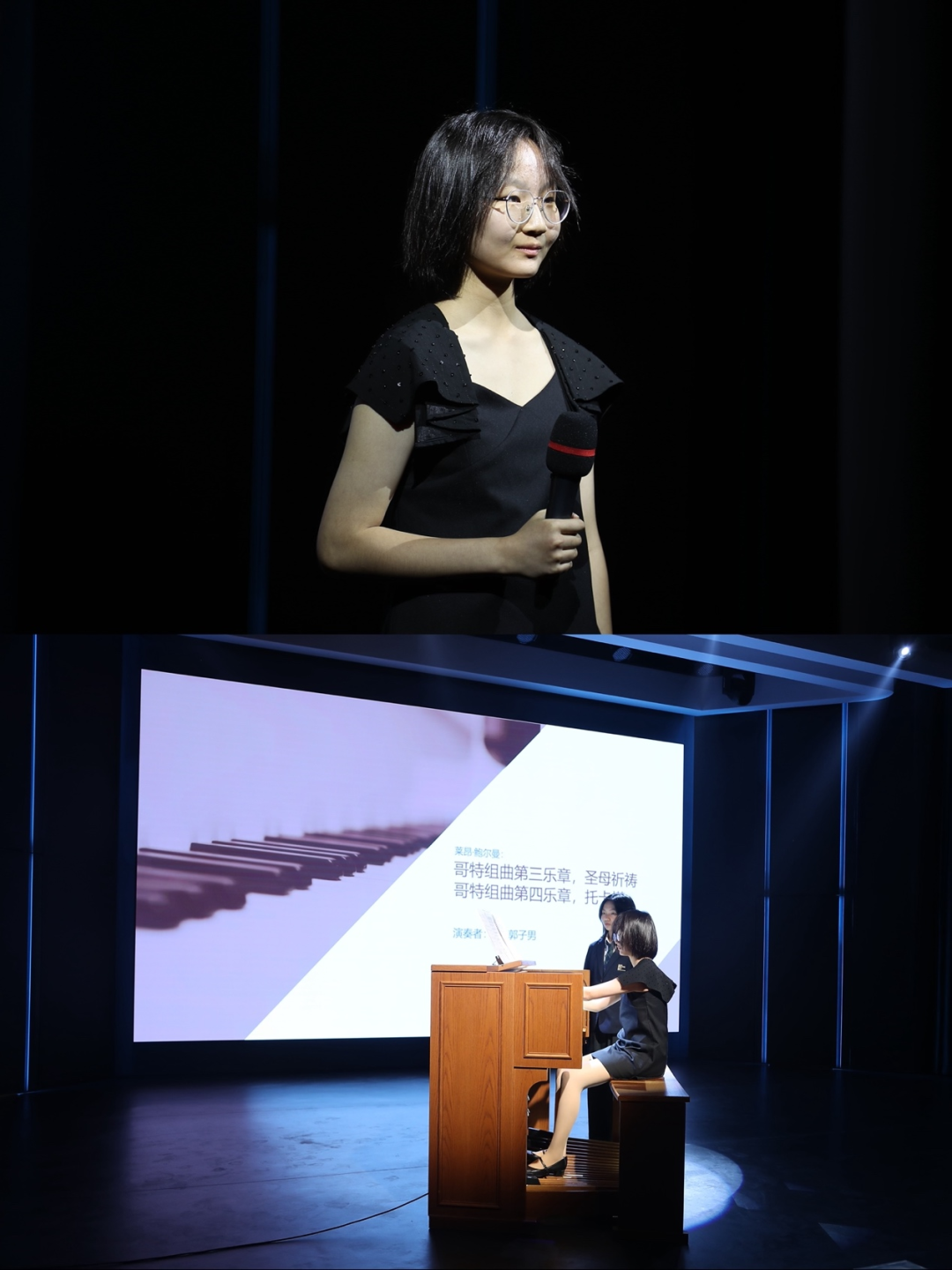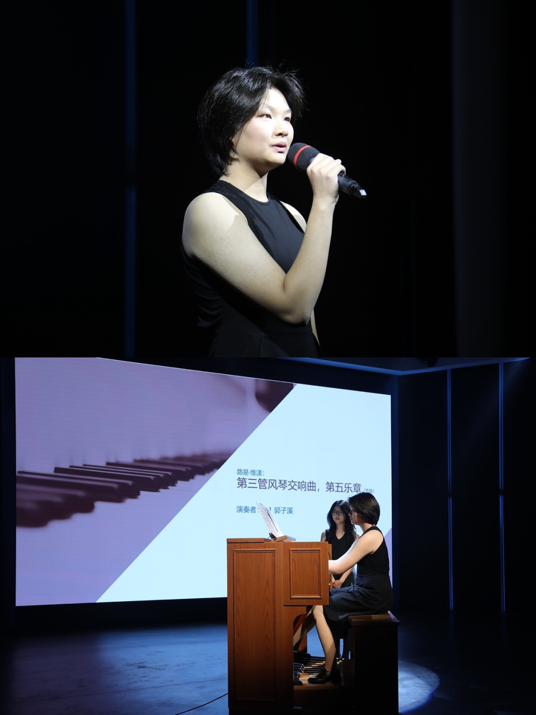 <郭子溪同学> 目前就读于致美班9年级,演奏路易·维漾的作品《第三管风琴交响曲》终乐章。她向大家介绍到,管风琴交响曲是浪漫主义时期管风琴乐曲的重要体裁,管风琴交响曲,曲风大气磅礴,声音宏伟,声部交织,相当于一整个交响乐团在演奏。