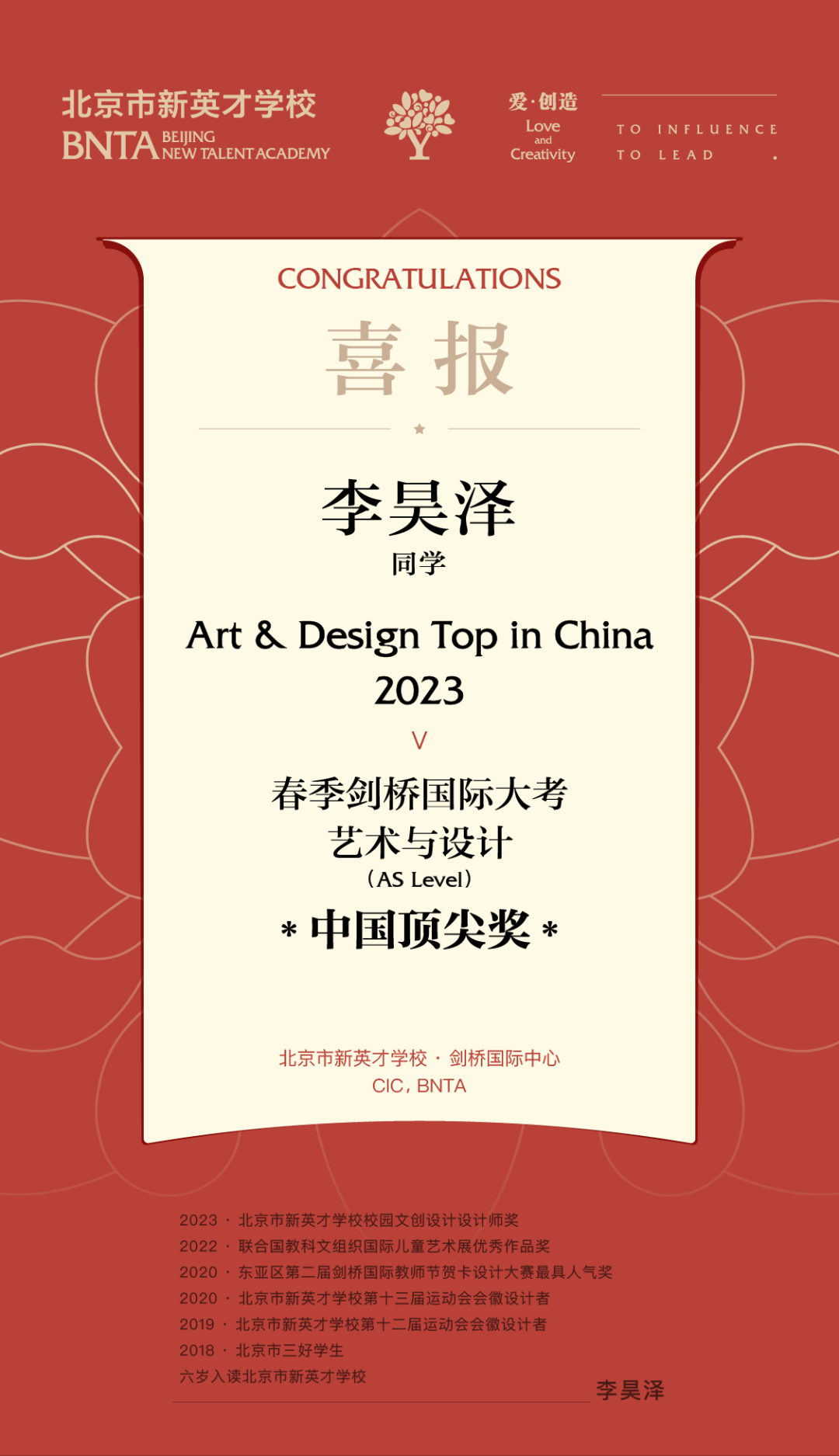 李昊泽同学为恒信彩剑桥国际中心的荣誉墙再添荣光。