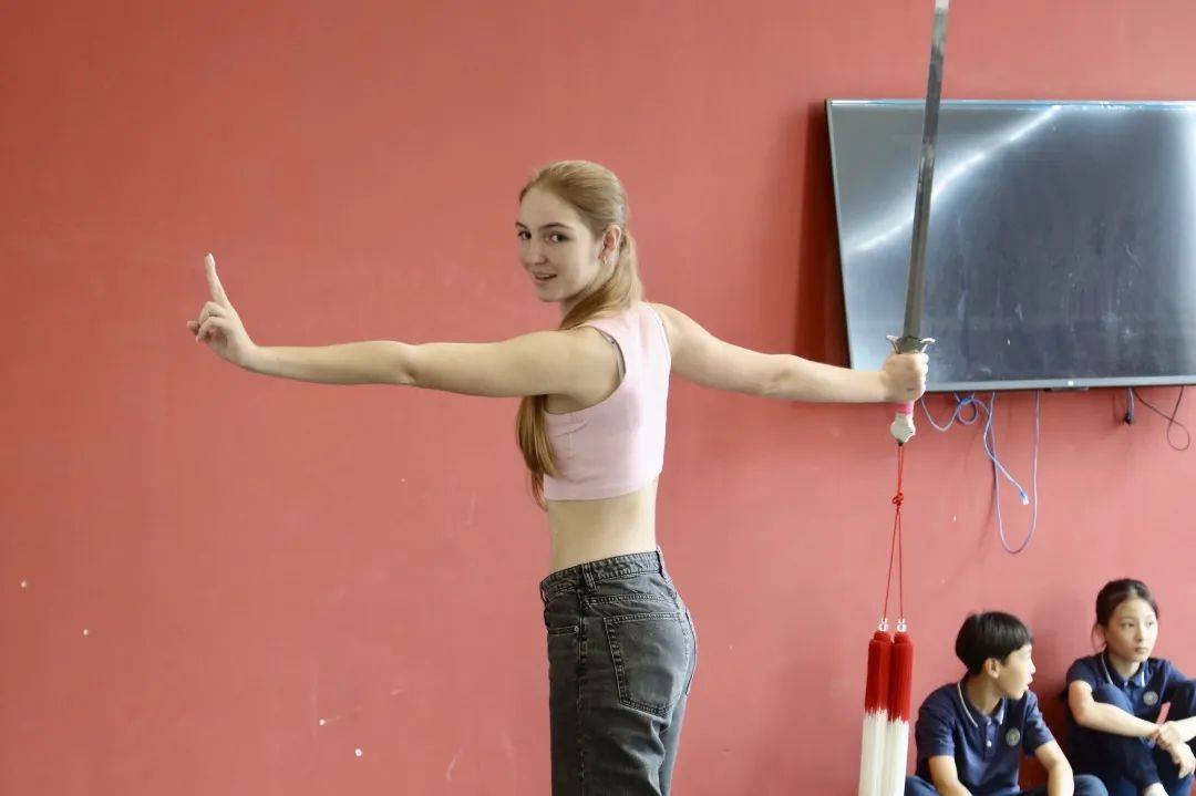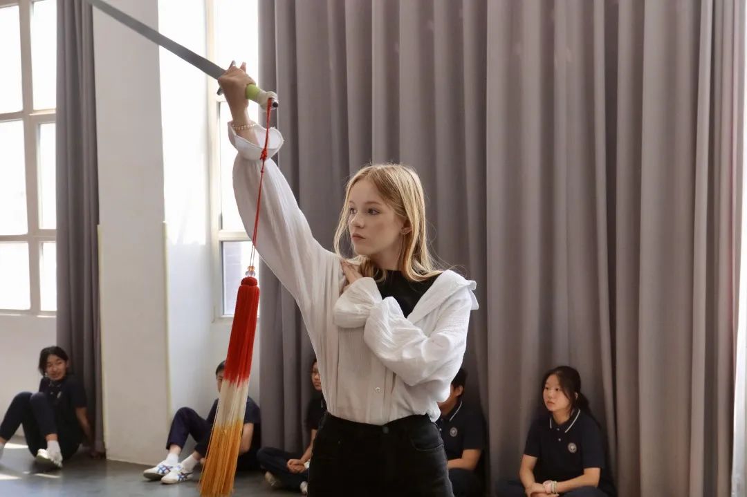 六年级的学子们手持一把飘逸的软剑,剑身上装饰着随风摇曳的流苏,仿佛古代侠士的化身。在“剑舞”课堂上,参访者跟随老师的优雅指挥,舞动软剑,剑光闪烁,流苏随风飘舞,每个动作都洋溢着豪迈与壮志,仿佛引领人们穿越历史长河,感受那份深邃情怀。三年级的同学们则在苗族舞课堂上欢快地舞动,展现出苗族舞蹈的独特魅力,仿佛让人置身于一个充满欢乐的苗族节日之中。而在二年级的儿童舞蹈与古诗词课堂上,孩子们则用舞蹈诠释古诗词的韵味,将中华文化的精髓融入每一个动作之中,充满了童真与诗意。这些精彩的舞蹈表演不仅展示了学生们的才华与热情,也使在场观众深刻体会到中华文化的深远影响和独特风貌。
