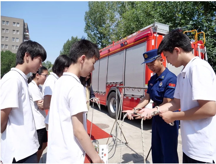 互动体验区内,逃生结绳训练、实验室逃生、初起火灾模拟灭火等项目吸引了众多学生驻足观看,互动学习。“在逃生结绳训练中,我学习了双平结、八字结的系法,很实用。”学生杜睿表示。