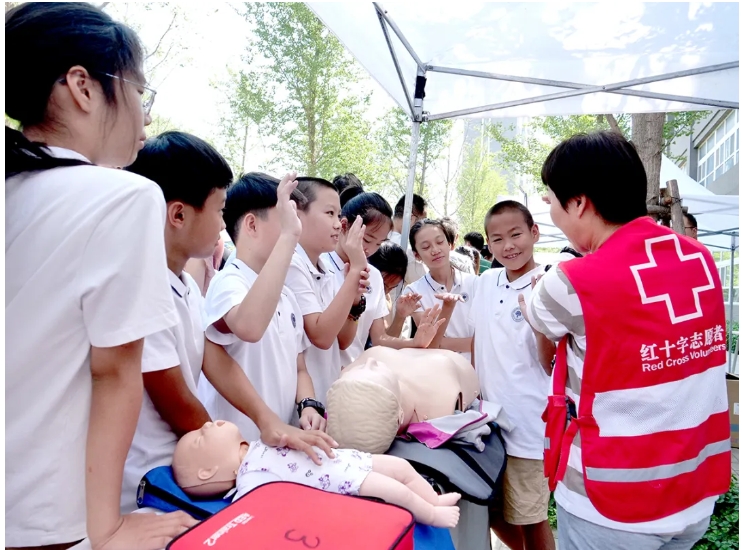 区红十字会开展的心肺复苏、人工呼吸等急救技能的参观体验活动也激发了学生对了解急救知识的兴趣。学生们纷纷上前体验,积极向区红十字会志愿者提问。