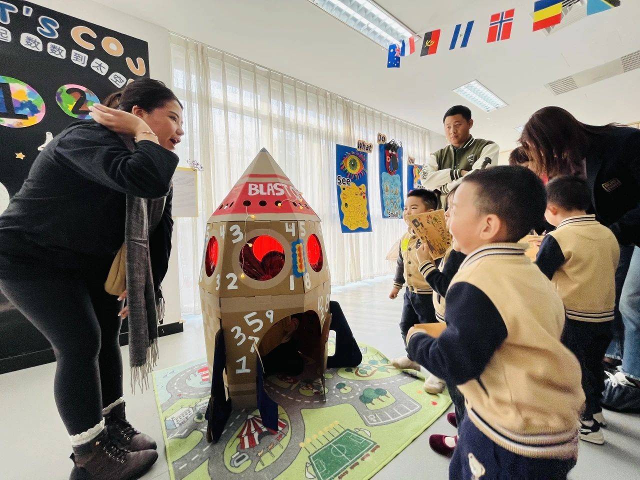 在这过程中,外教老师们会穿插问地问孩子,你有几个好朋友?他们是谁?想和他们一起飞向太空吗?你们怎么打招呼等简单问题。孩子们需要英文进行回答。在这种情景化、游戏化的互动中,孩子们的外语水平在潜移默化中得到了提升。