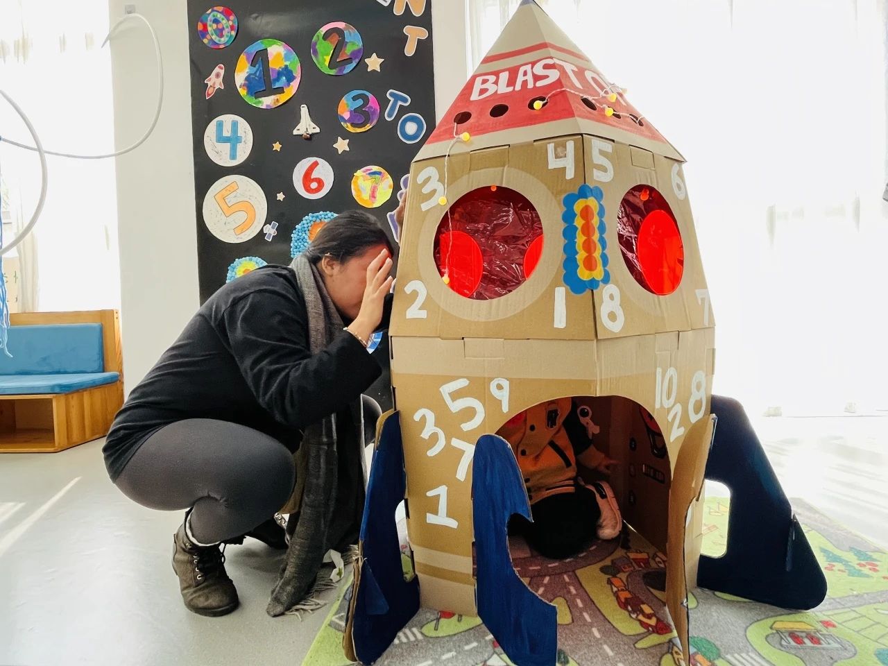 作为本次展览的“人气作品大网红”,在展览当日,孩子们都直奔这个大火箭而来。面对蜂拥而至的小朋友们,守在旁边的外教老师会先会英文问孩子你叫什么名字,在得到回应后,老师会让孩子进入到火箭里。在驾驶舱中,孩子们要用英文从0数到10再倒数回来,从而模仿火箭发射的样子。当孩子们完成一系列“准备工作”后,外教老师就会模仿火箭发射的样子,与孩子们一同进入太空。