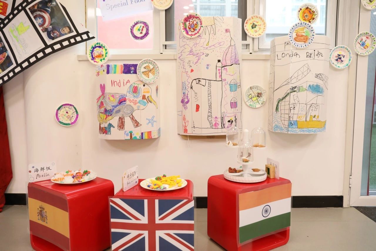 在本次跨学科主题教学展览中,除网红大火箭活动外,英文与双语元素也随处可见。比如在大班的展区中,孩子们要走向前台,用英文来向同学、老师与家长们介绍印度“萨莫萨”、西班牙海鲜饭、英国炸鱼薯条等世界多国的美食,把自己探究出来的各个国家特色进行展示。