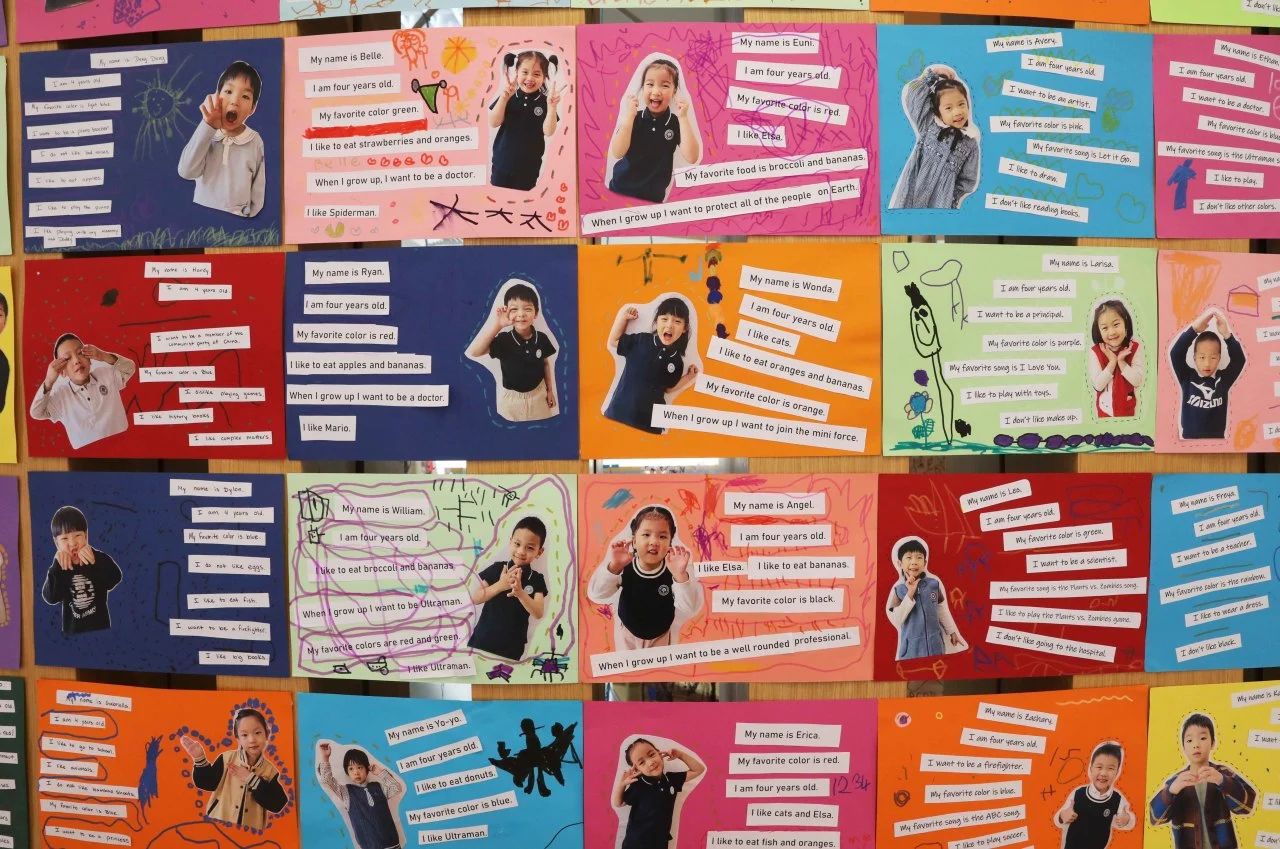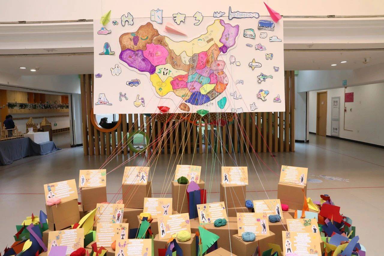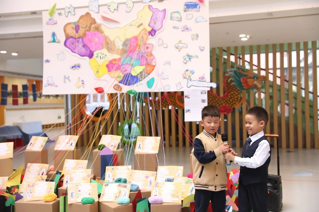 作为一所国际化幼儿园,恒信彩幼儿园的孩子们来自五湖四海,本身就带有多元的文化。在大班展区的中央,悬挂着一幅巨大的手绘中国地图,孩子把写好的自我介绍与地图上的家乡用彩线相连。通过扫描自我介绍上的二维码,就可以看到孩子们用英文落落大方介绍自己与家乡的视频。