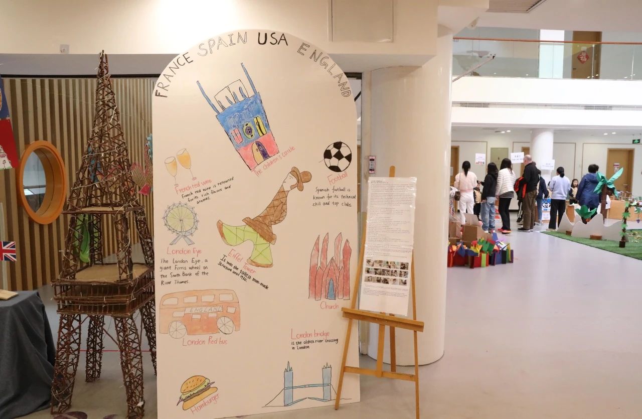 在展览中,有的班孩子们也戴上假发套,把自己装扮成牛顿来讲述英国,或者把自己装扮成西班牙人,来讲大航海与西班牙的故事;有的班孩子制作了中国的大熊猫、法国的葡萄、日本的樱花等代表不同国家的文化代表元素的创意手工。