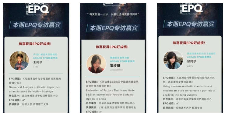 剑桥国际中心的学生自10年级起,全员参与EPQ项目,截至2024年,已有50余名同学获得A以上的成绩,累计23名学生的学术研究被选入优秀课题展示。