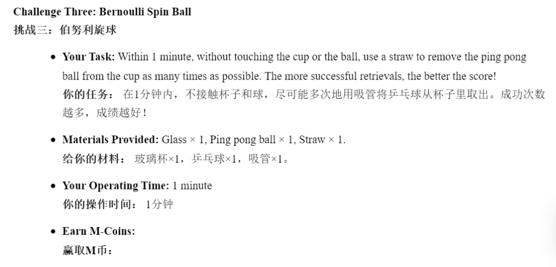 “伯努利旋球”挑战中,参赛者需在一分钟内,不接触杯子和球,仅用吸管将乒乓球从杯中取出。AP国际中心的李虓在前30秒屡试屡败,乒乓球始终在杯底打转。但他迅速调整了吸管角度与吹气力度,在后半程成功掌握技巧,成为全场取球次数最多的“黑马”。