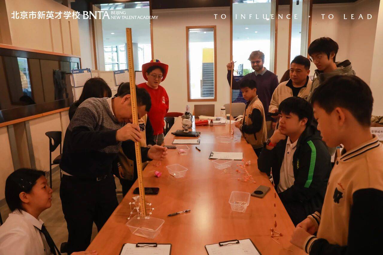 “牙签摩天楼”环节,学生用牙签和橡皮泥搭建塔楼,不仅要追求高度,还要经受手持风扇的考验。初中部乔子曦凭借稳定的三角形架构,获得了全场最高成绩。