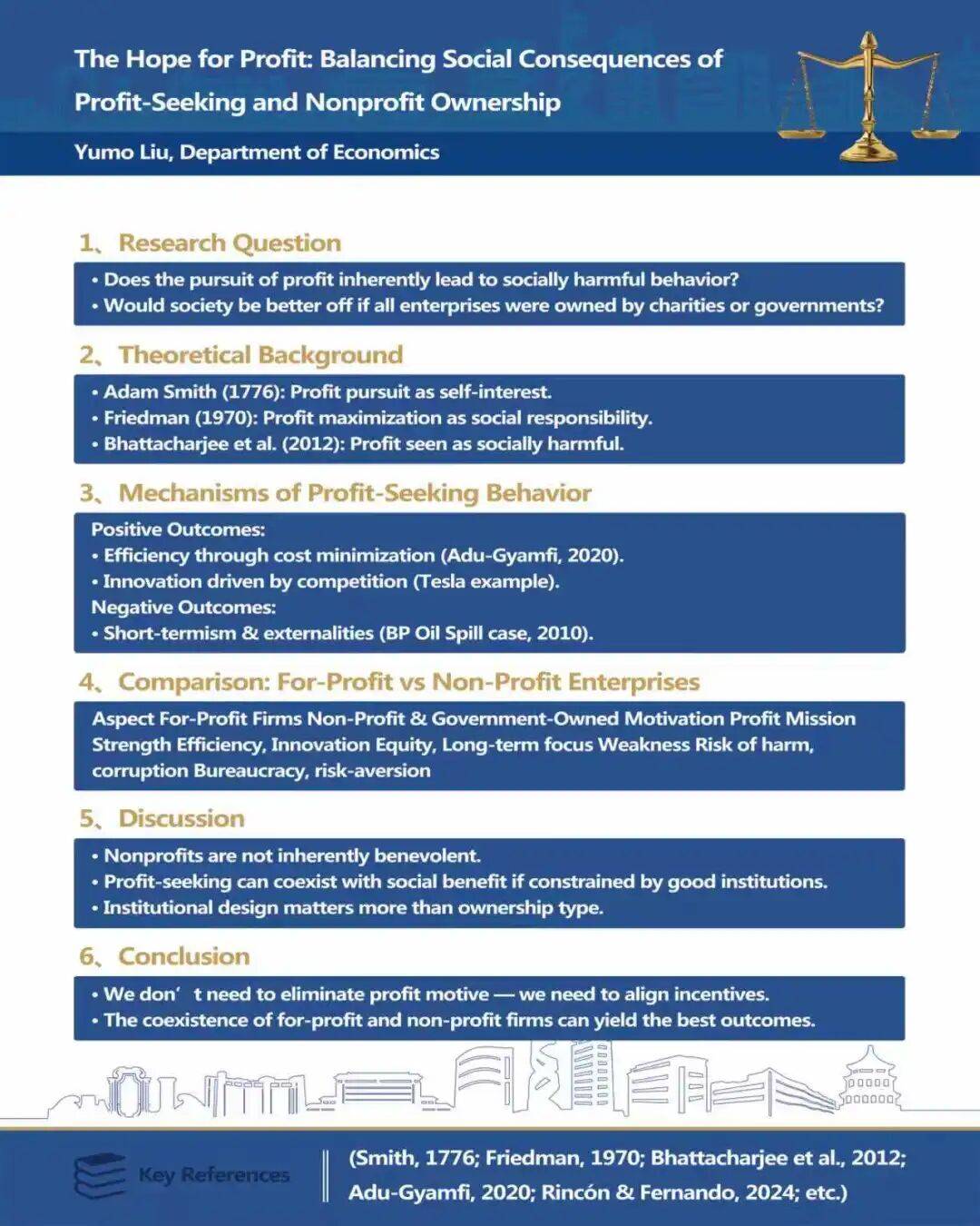 课后,他进一步思考并提出疑问:“如果社会企业的目标全部变成非营利性的,社会运转是否会更高效?”带着这一问题,他查阅并梳理了弗里德曼等学者的经典理论,并通过特斯拉开放专利与BP漏油事件的正反案例进行对比,系统分析了营利与非营利组织在社会价值创造上的差异。批判性思维下,展现出青年学子对社会经济问题的深刻思考。
