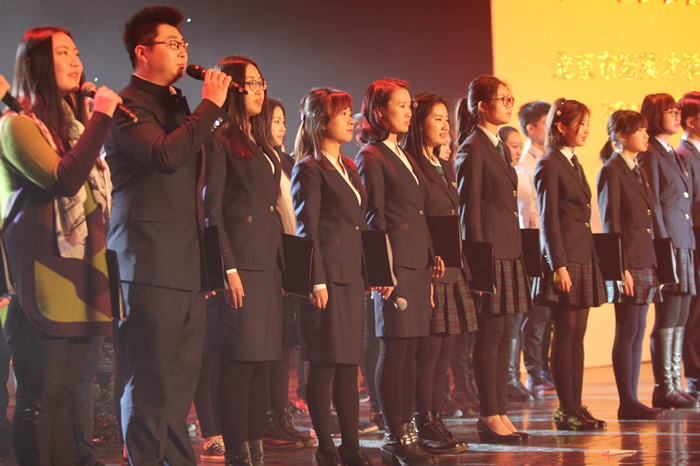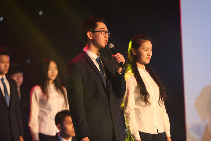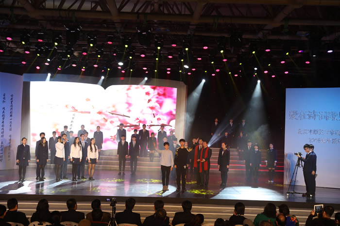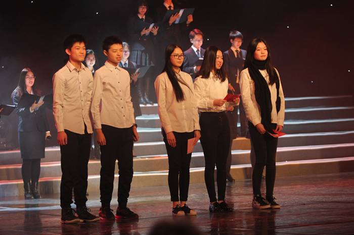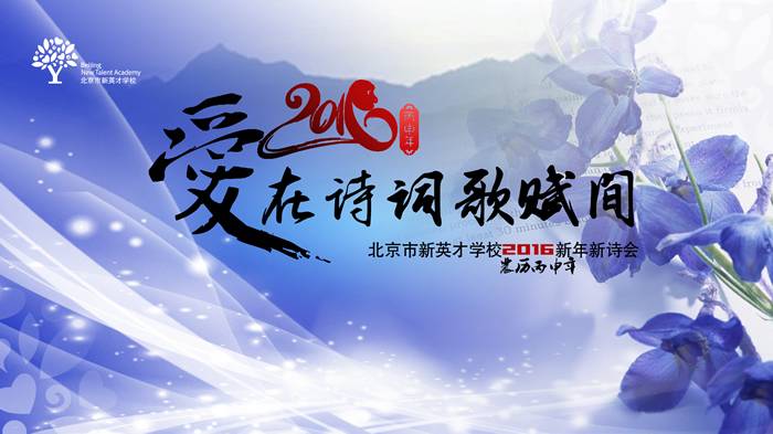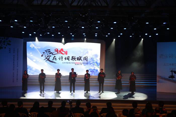 “爱在诗词歌赋间”2016新年新诗会由学校各学部学生代表:剑桥国际中心8A班徐孙云涛同学、AP国际中心高一(1)班李菁菁同学、幼儿园中班秦皓轩小朋友、小学部三年级田美同学、汉语中心来自立陶宛的边天雷以及特邀嘉宾共同主持。