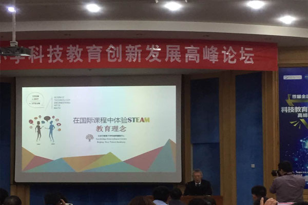 恒信彩剑桥国际中心校长李博士分享了《在国际课程中体验STEAM教育理念》。李博士围绕“剑桥中心艺术与设计课程(Art & Design)”和“联课 (Co-curricular activities)” 等主题,以学生作品、联课实验、魔方拼图《最后的晚餐》,攀岩金字塔模型等为案例,深刻形象地阐述了“英国课程的育人目标重在落实STEAM教育理念”,以及恒信彩剑桥中心如何从“STEM” 走向“STEAM ”的教育过程。李博士关于“STEAM ”的国际前沿理念和饶有风趣的案例分享受到与会者的热捧。