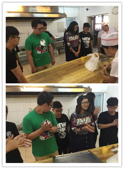 餐厅的阿姨传授做月饼的经验,同学们学的很认真。