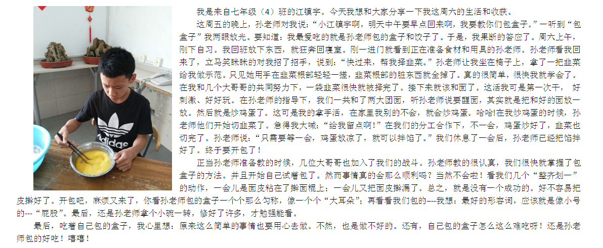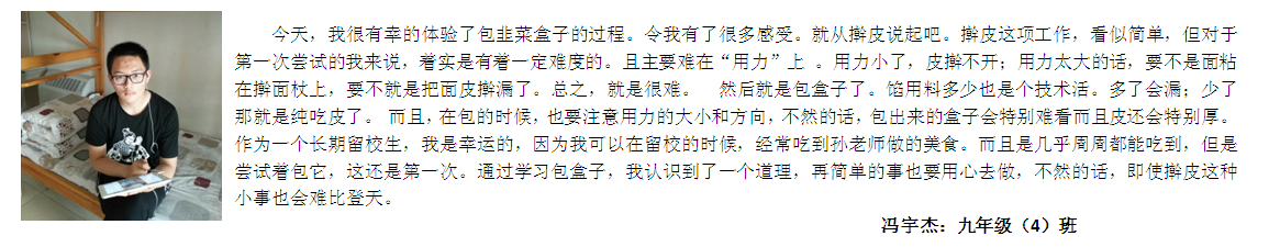 “在学校里,我感到了“爱”与“创造”,感到了“温暖”。留校时,我做了韭菜盒子,是在老师的指导下,我自己亲手做的,觉得还是很不错的。”——余潇峰: 七年级(1)班