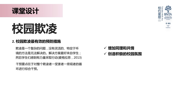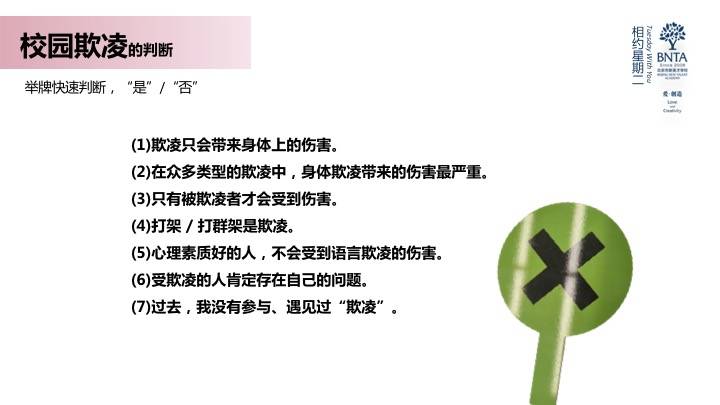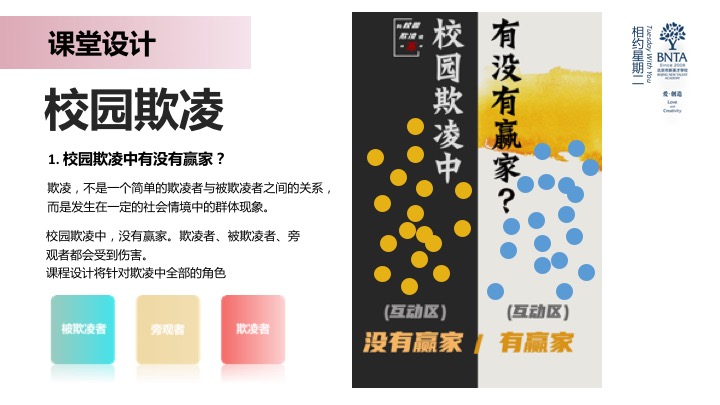 本次分享主要以“向校园欺凌说不”为主要内容,呈现游戏化的课程设计以及由此引发的一些教育中的感想。通过有趣的形式承载校园欺凌这个沉重的话题,带领学生深刻认识欺凌中的不同角色,了解与欺凌相关的法律知识;通过“剧情”的各种反转,让学生“参与”到剧情中的各种欺凌事件,从欺凌者、被欺负者、旁观者三个角度全方位认识欺凌行为,引导学生表达自己的真实感受,进而从情感上避免欺凌事件发生。希望通过这样一种沉浸式体验的形式,让学生对“欺凌”本身有更深入更全新的认识。让孩子们了解我们的每一个决定、每一次选择都可能改变别人的人生。