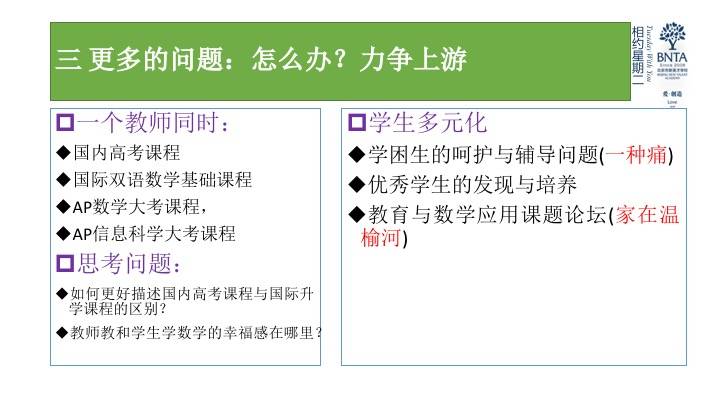 整个研究的过程可以为四个阶段:一之初、二回归、三深化、四系统,循序渐进的探讨了高中生成长规划六阶段建设(心理)、寻找数学学困生教学的突破点、如何规划中学生的数学素养成长及恒信彩特色的AP学科建设的问题。