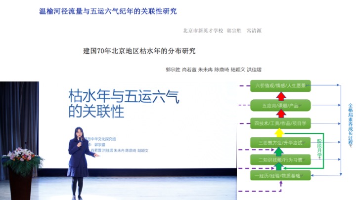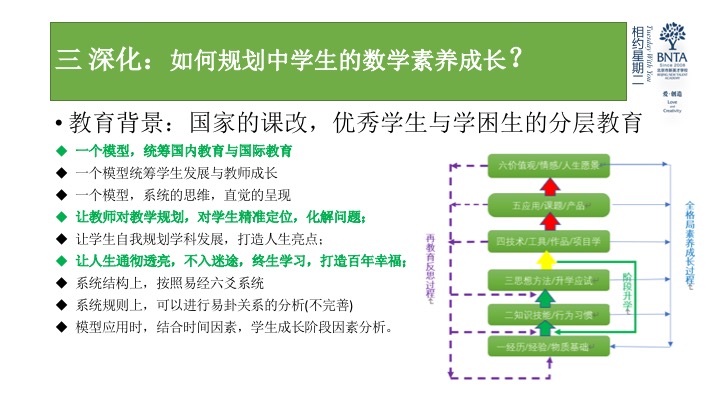 在对学困生的心理辅导到学科素养形成方面,郭老师将中国传统文化融入其中,借助中国传统文化中的思维方式和方法论,了解学生的身心和学习状态,探索因材施教的教学策略,构建适合学生发展的教育模型,如中学生自强不息六阶段成长模型、教育教学元素的五行五德辩证关系、中学生数学素养发展的六个阶段和六种要素。这个过程亦是一个学科融合的过程,在数学学科学习的过程中,使学生自然而然的理解和品位了传统文化,这种人文、思辨及理性思维相结合的方式很好地培养了学生的综合素养。