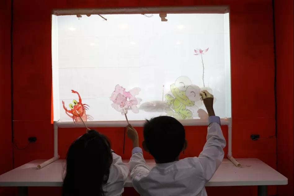 荷塘小剧场根据学生写作过程中,故事比较缺乏逻辑性、语言组织不顺畅等问题,借鉴中国传统皮影剧艺术并改进,设计了适合小学生的游戏角色及有趣的互动场景,学生也可以自由创作,根据自己创作的角色和故事情节,进行故事演绎,从而锻炼学生的故事创作、语言表达、设计思维、创意创造等能力。