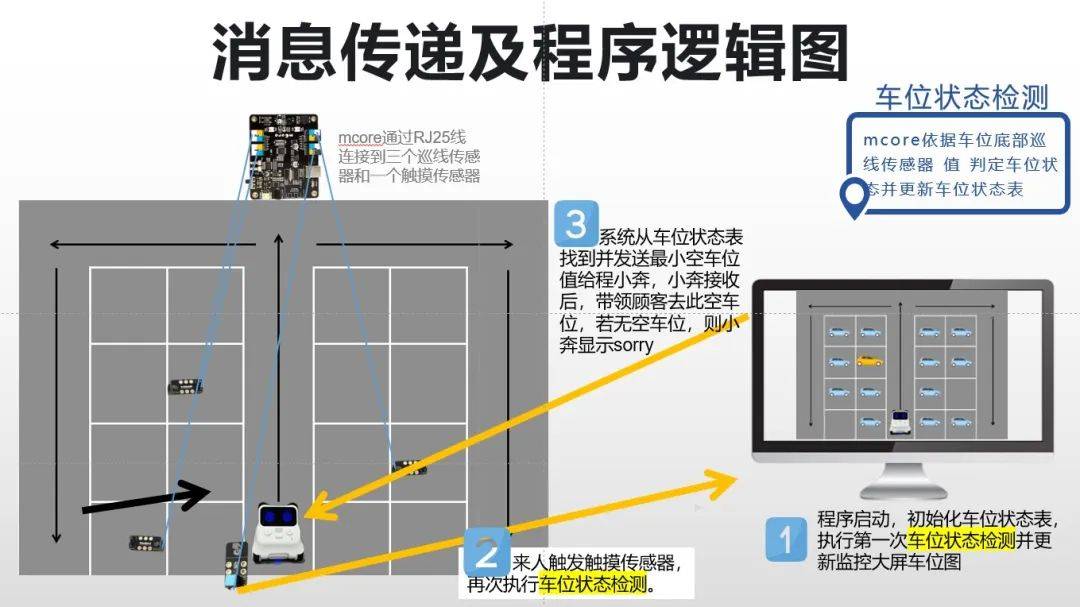 为了引导司机更精准的找车位,我们制作的停车场引导系统主要有两个功能——①空车位检测,系统根据每个车位底部的感应器判断车位当前状态并于监控大屏显示(有车/无车);②小车带路,小车得到系统传来空车位值,引导司机前往具体位置。