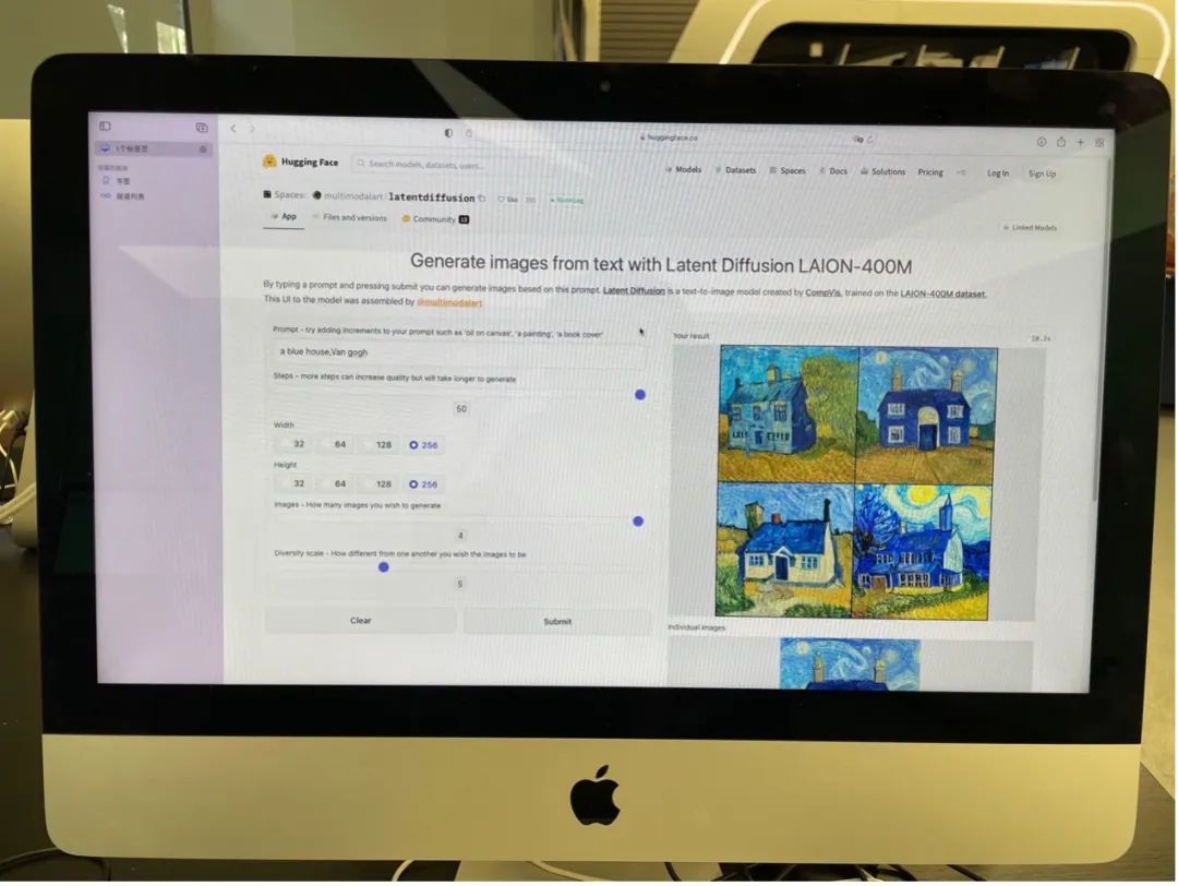 一位同学在系统中输入了“梵高风格的蓝色房子”后,AI仅花10秒钟就创作出了四幅可以“以假乱真”的绘画作品。
