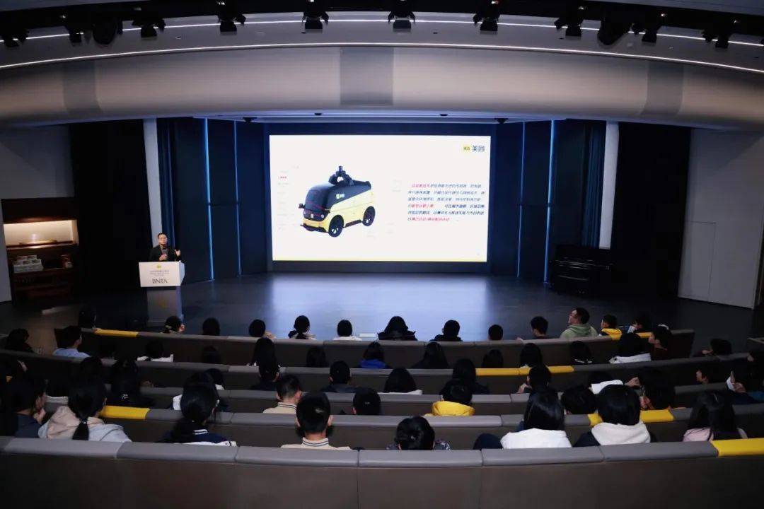 活动邀请到了美团自动车配送部政策与策略研究总监曾辉,他以幽默通俗的语言为学生们讲解了自动驾驶相关背景知识及自动配送如何改变大众生活,使同学们更加了解自动驾驶技术与自动配送的高效性、安全性、便民性。