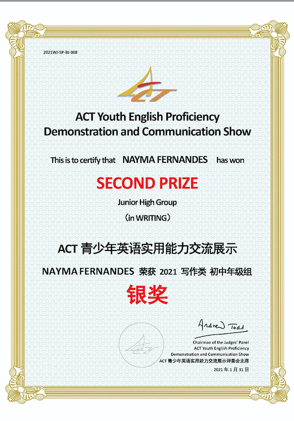 奈依(安哥拉)荣获写作类初中组银奖;