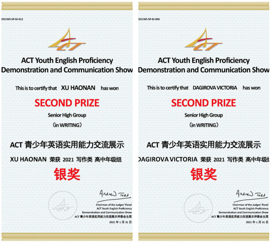 恒信彩汉语中心于2020年底举行了ACT英语大赛预赛和复赛,经过紧张而激烈的考试,汉语中心选拔六位学生代表恒信彩学校参加《ACT全国青少年英语实用能力交流》总决赛。六位学生凭借自己在英语交际中的实力与勇气,在本次ACT全国英语比赛中,取得优异成绩。