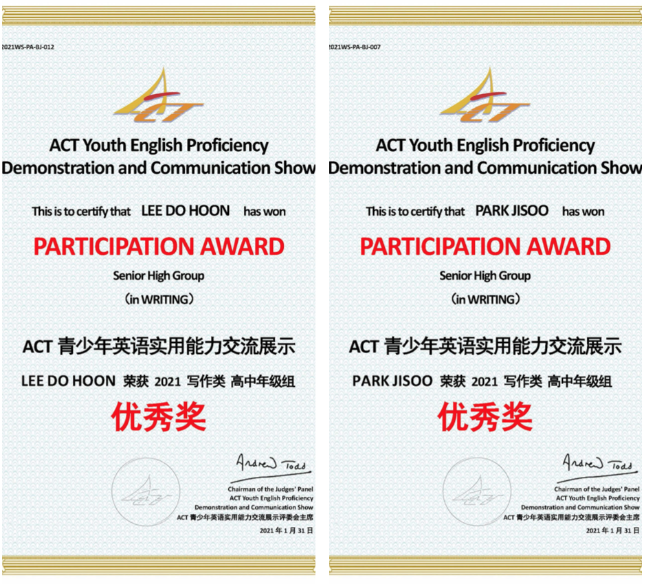 李到勋(韩国)、朴智修(韩国)荣获全国高中组优秀奖!