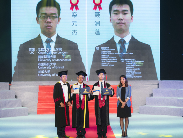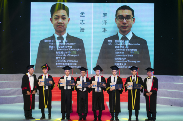 英国萨塞克斯大学国际教育官员 潘晶女士 为荣获特殊贡献奖的毕业生 栾元杰、聂润蓬 颁发毕业证书并授予荣誉带