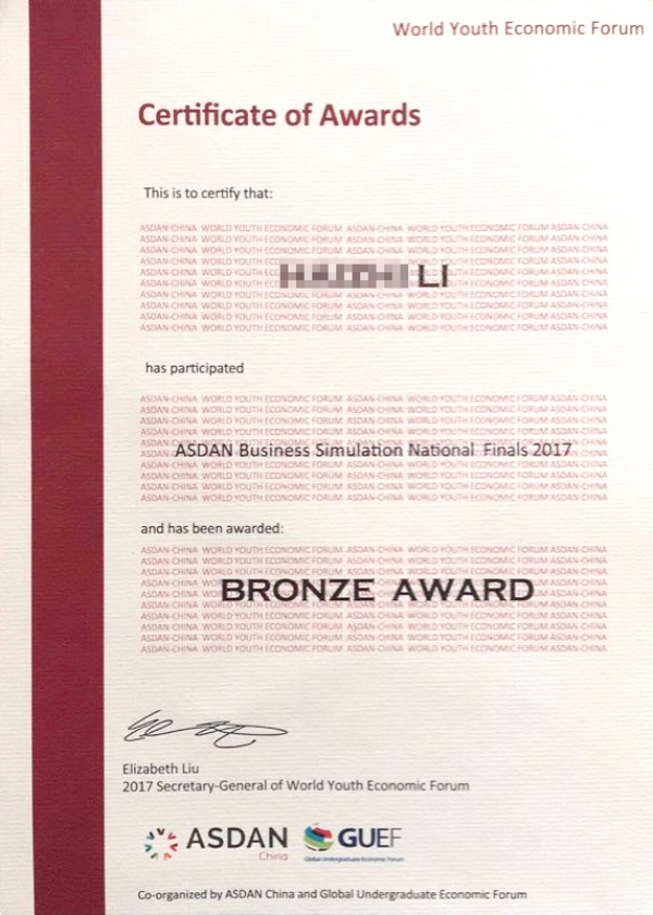 在比赛中,排名进入前50%的公司会获得 ASDAN 青年企业家证书。ASDAN作为英国素质教育发展中心,是全球最有影响力的国际素质教育机构。证书由ASDAN 总部颁发,得到英国教育部授权,证明学生在商学活动中的优秀表现,同时在英国、美国大学申请中,可作为权威认证证书,证明学生商学活动经历。